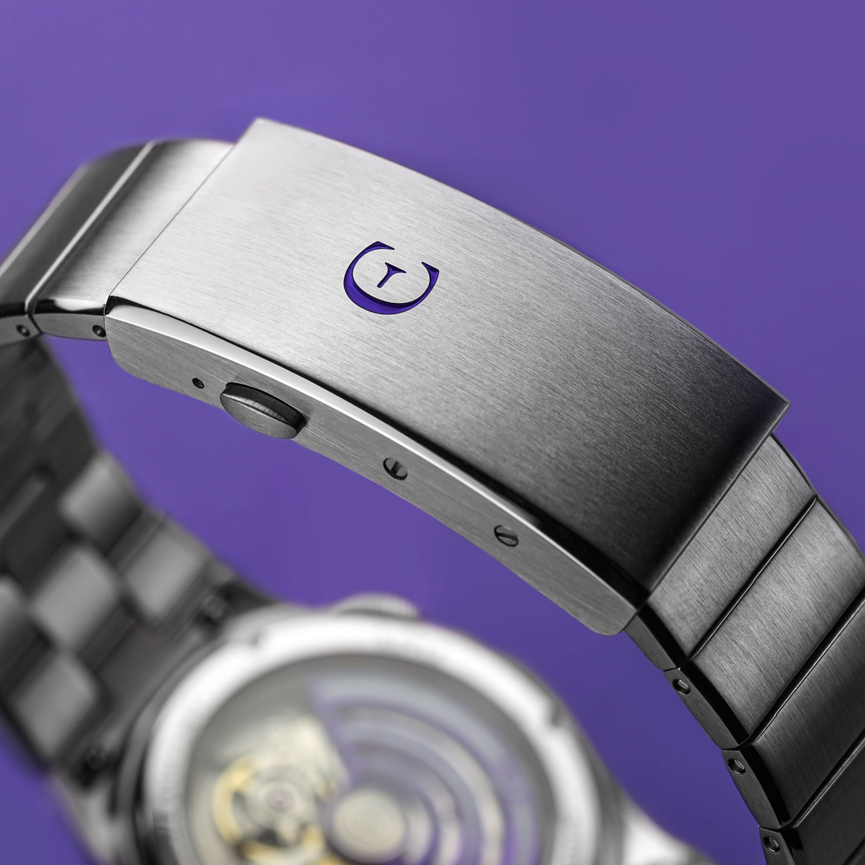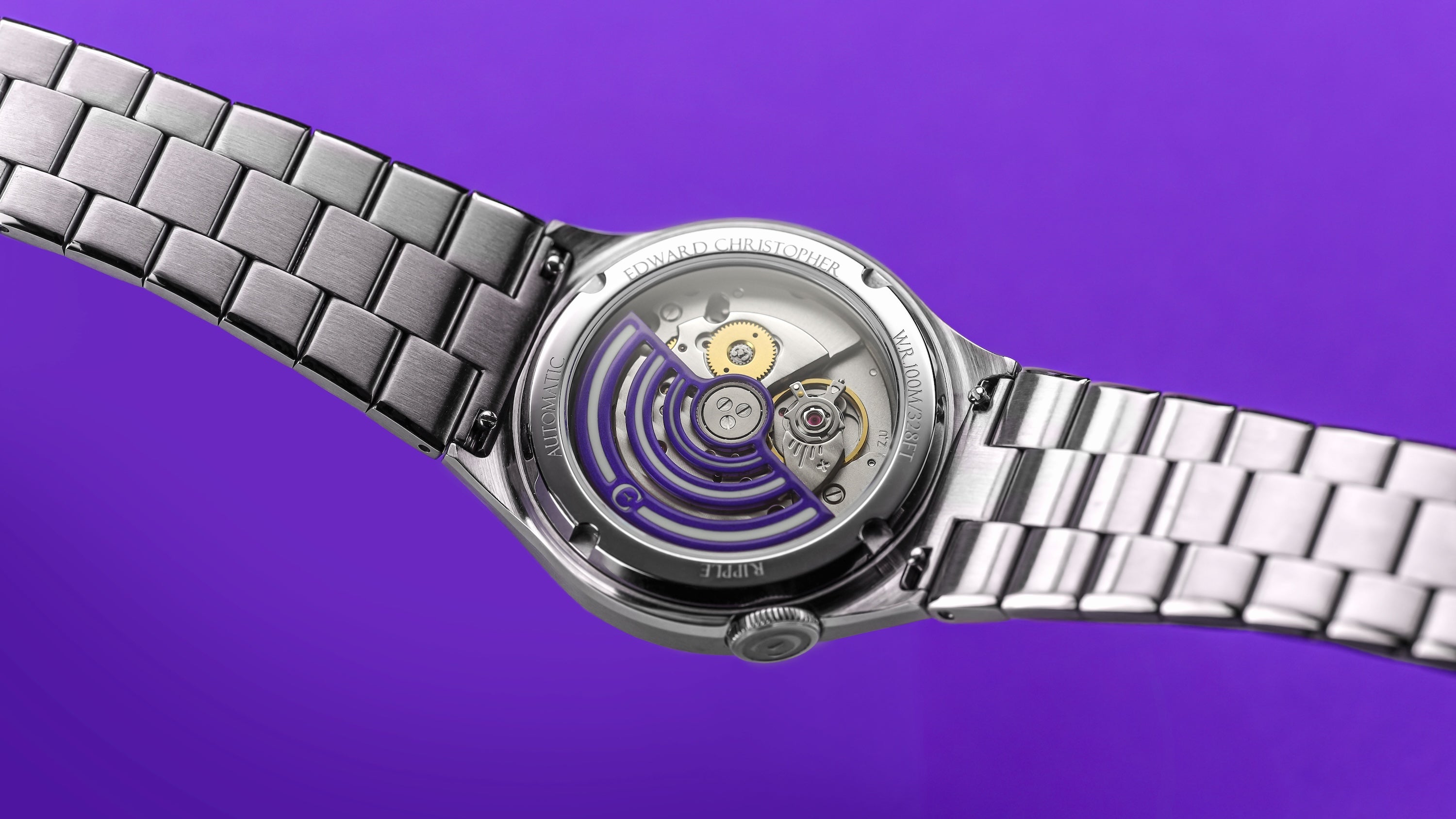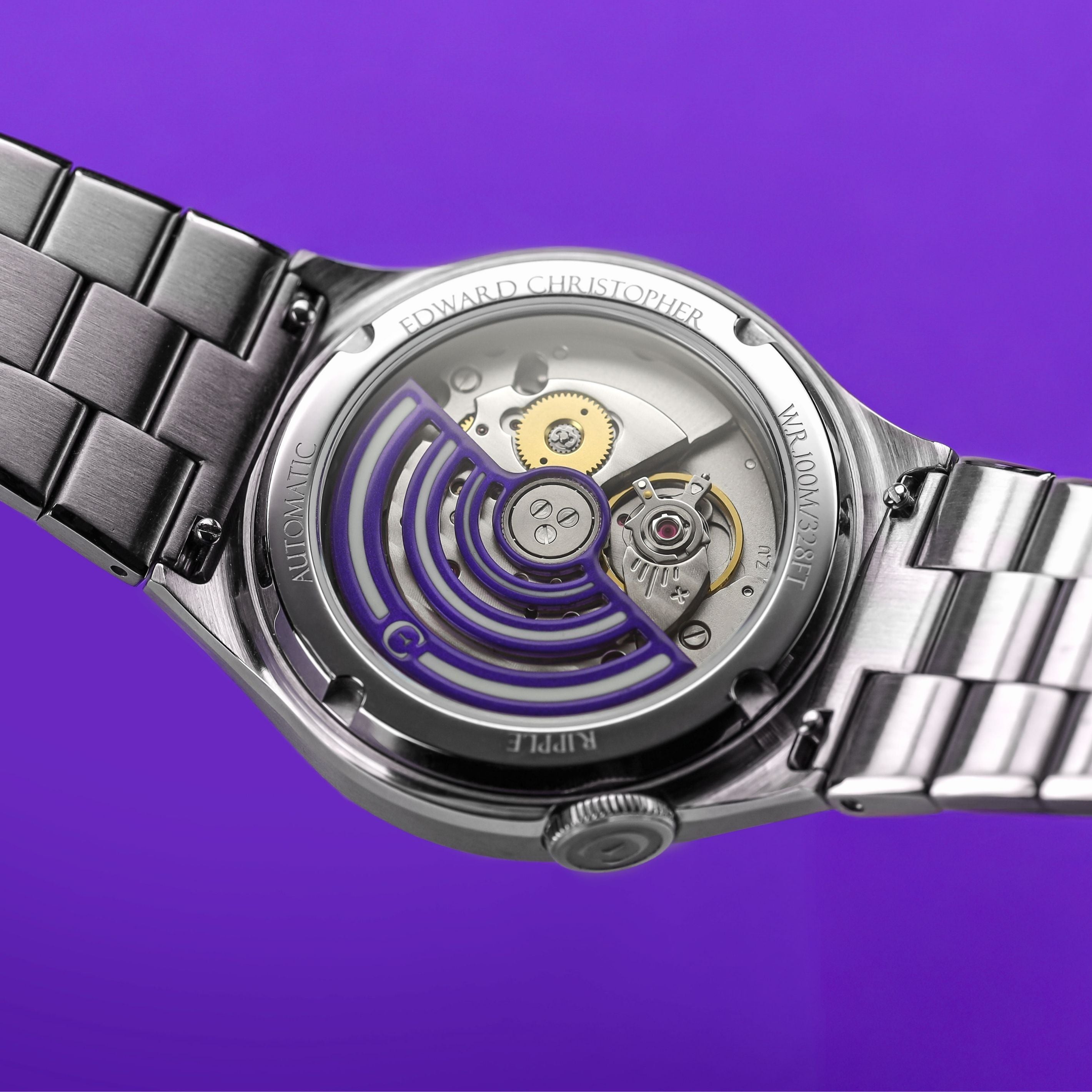 The striking visuals continue on the underside with the sapphire crystal exhibition case back. This features a unique and distinctive vented rotor, in our Edward Christopher violet/purple brand colour (on all these watches), that drives the Miyota 9039 self-winding automatic movement, with its 42 hour power reserve.